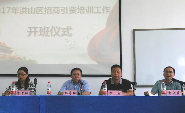 (通讯员:陈家希)5月18日上午9点,洪山区招商引资工作培训会在文清楼四楼会议室顺利举行开班仪式。洪山区副区长杨海松,洪山区商务和旅游局党委书记、局长李青梅,我院党委书记李宏出席了本次会议。培训办主任曾大庆老师主持了本次开班仪式。