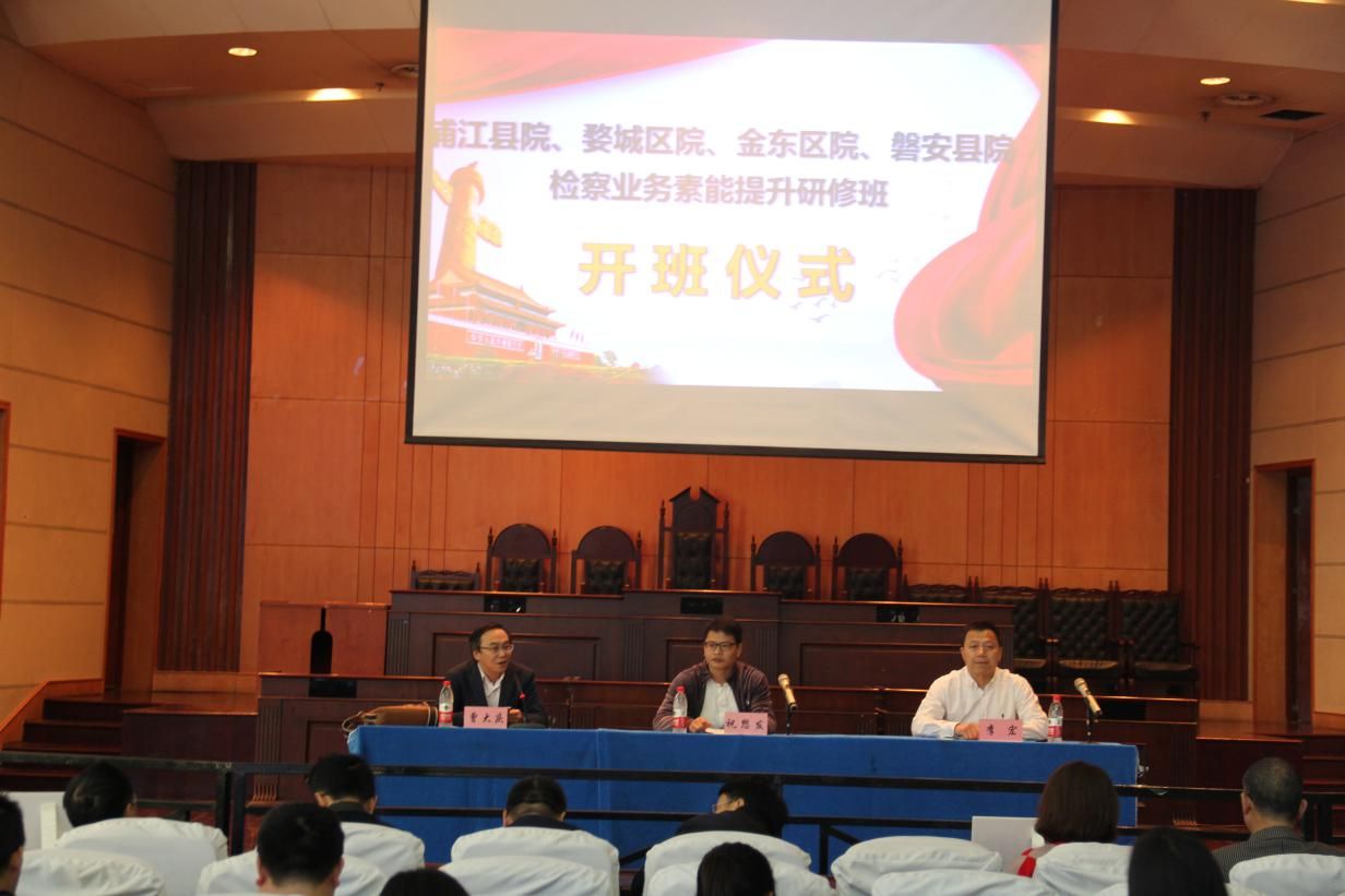 3月27日上午,浙江省浦江县院,磐安县院,金东区院,婺城区院检察业务素能提升研修班在文泰楼模拟法庭(一)开班。浦江县人民检察院党组副书记,副检察长祝懋发同志,我院党委书记李宏同志及四院共100余名检察官出席了本次开班仪式,本次仪式由免费av影片 培训中心主任曾大庆老师主持。