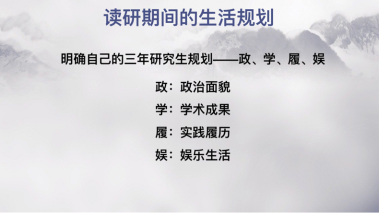 随后,为了更好地帮助同学们作出生活规划,李家琪同学细致全面地于政、学、履、娱这四个方面进行介绍:于政,应严格遵守党纪党规,根据自身政治面貌来规划入党申请;于学,应妥善安排修习学分,同时积极规划论文撰写与发表;于履,应充实校内、校外实践经历,完善自身履历;于娱,应丰富自己的课余生活做到劳逸结合。