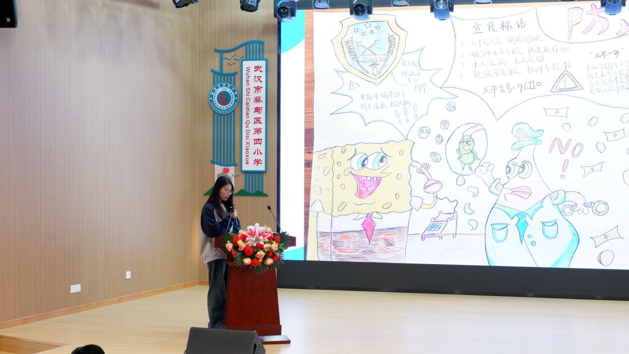 接下来,入党积极分子黄梦月展示了防诈手抄报作品—《防止诈骗:海绵宝宝告诉你怎么做》。通过学生喜闻乐见的形式,生动形象地展示了反诈的“三不一多”原则(即:未知链接不点击,陌生来电不轻信,个人信息不透露,转账汇款多核实),号召同学们与警方一起守好“钱袋子”。
