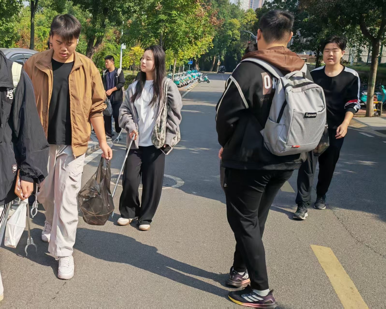 午后清风徐徐,志愿者们准时在文治楼前集合。大家手持清洁工具,分组有序前往中南大道及中区主干道沿线。同学们协作清扫、仔细捡拾,清理落叶与杂物,连角落缝隙也不轻易放过。忙碌的身影与秋日校园相映成趣,构成一幅生动的劳动画卷 。