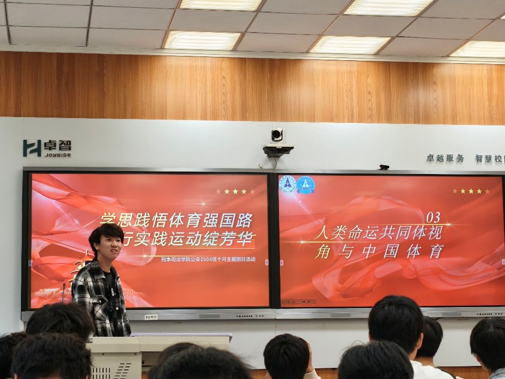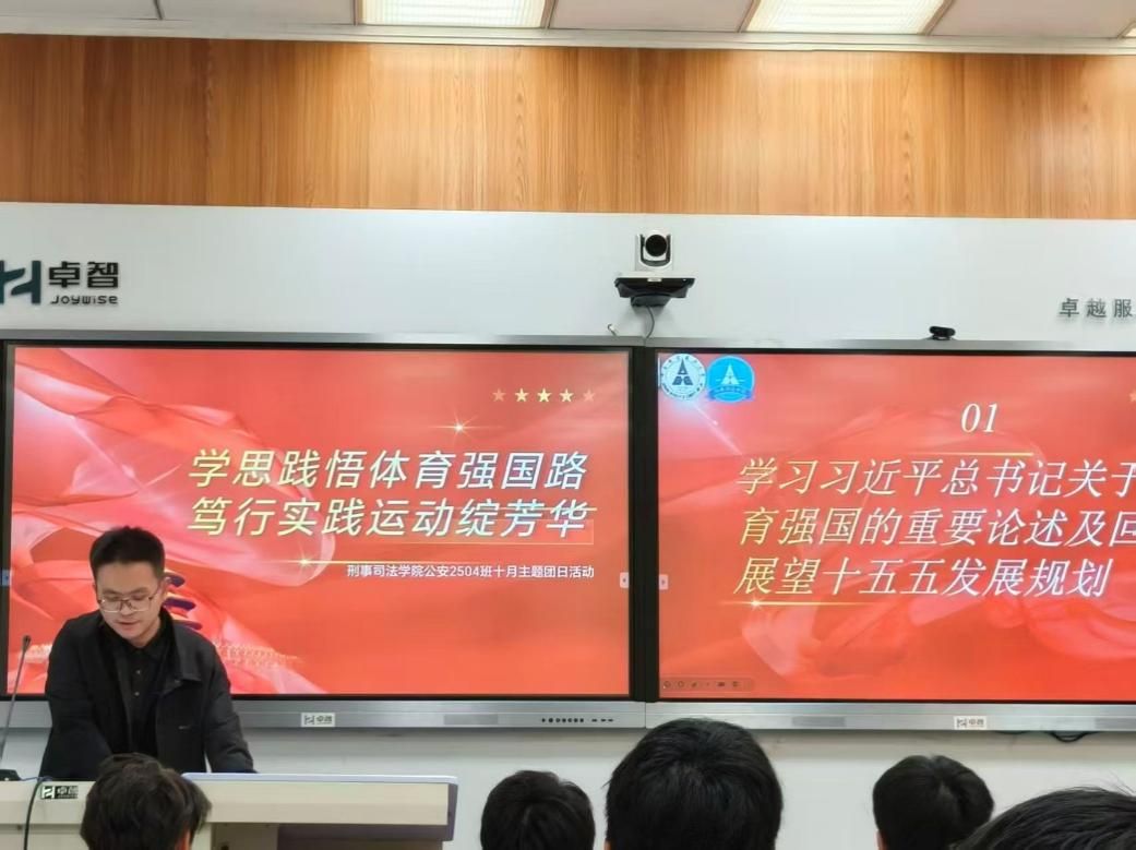 活动伊始,团支书金宇翔通过对国家体育成果的总结和对未来的展望向同学们进行讲解。“十四五”收官之际,我国体育事业在场地设施、全民健身、竞技体育、体育产业、青少年健康等领域成果斐然。展望“十五五”,我国将全面建成体育强国,实现体育设施全域普惠、体育产业全球领跑、全民健康素养与竞技体育实力双跃升。