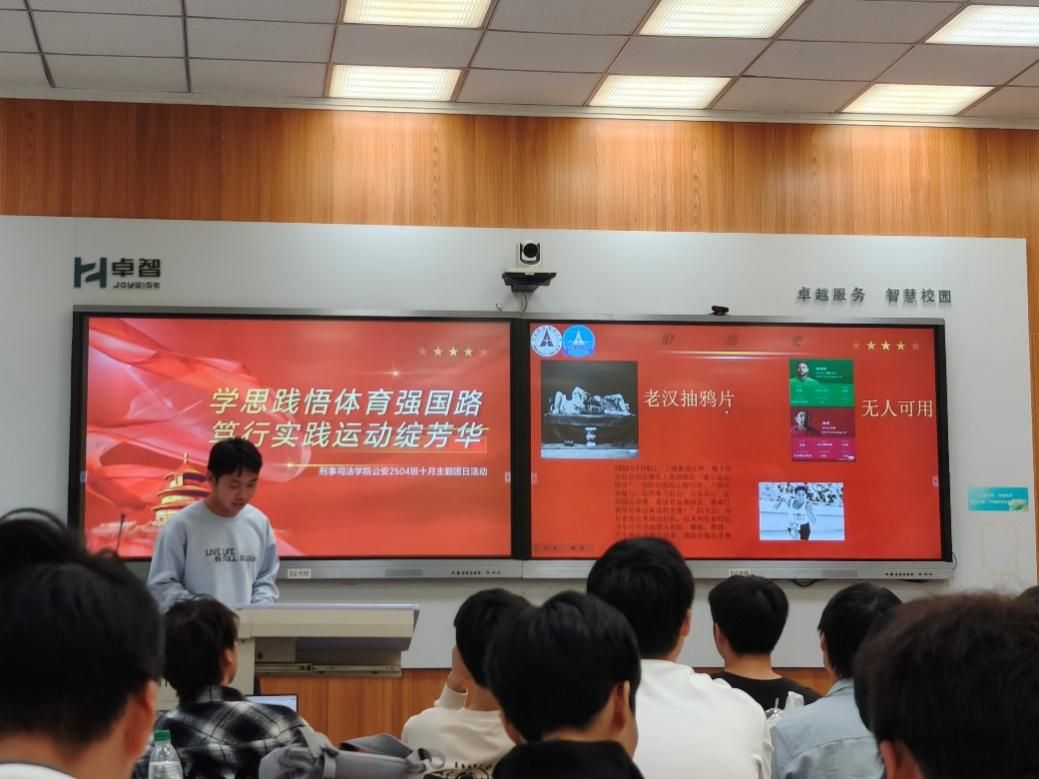 活动进入第二板块的学习,班长魏宇涵以“中国青年从体育大国到体育强国的奋斗历程”为主题,带领团员们回顾峥嵘岁月。旧中国国力衰微,体育事业举步维艰,1932年刘长春参加洛杉矶奥运会,是首位踏上奥运赛场的中国运动员,承载民族期望。中华人民共和国成立后确立体育事业指导方针,1951年第一套广播体操颁布,全民健身兴起。改革开放后中国体育走向国际,2008年北京奥运会获51枚金牌,展现崛起姿态,团员们在历史对比中深切体会到体育发展与国运兴衰的紧密关联。回顾历史,感悟体育发展奋斗征程。