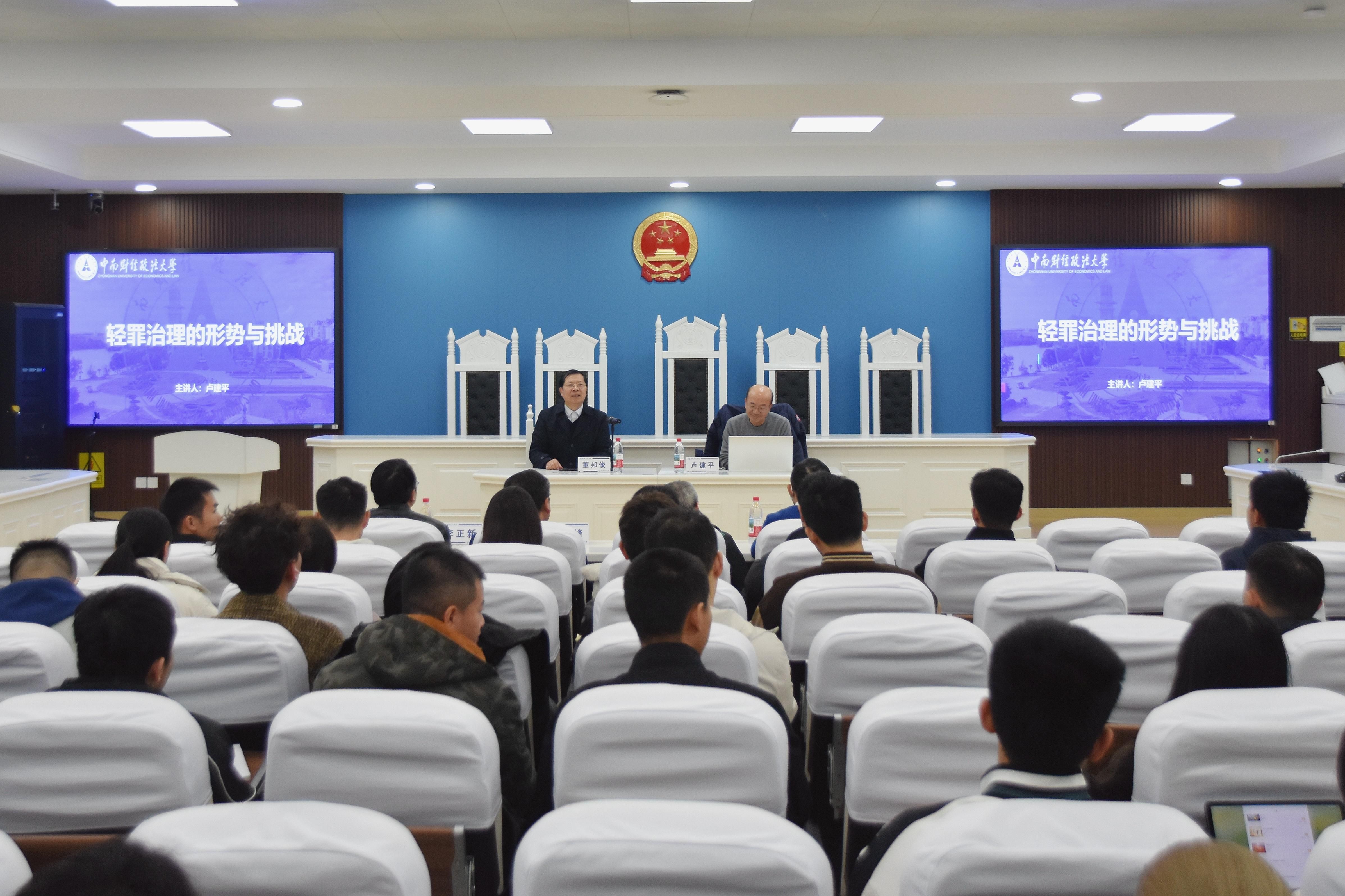新闻网讯(学生通讯员 查盈盈 拍摄 王佳忆)2025年12月2日下午,由免费av影片 承办的第22期“中南大讲堂”之名家讲堂在文泰楼模拟法庭举行。本次讲座聚焦“轻罪治理的形势与挑战”,特邀北京师范大学法免费av影片 二级教授、博士生导师卢建平担任主讲人,免费av影片 教授、博士生导师、院长董邦俊主持讲座,免费av影片 副院长焦俊峰教授、法免费av影片 周详教授、王安异教授、免费av影片 李正新副教授应邀担任与谈人,免费av影片 部分博士、硕士和本科生到场学习。